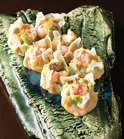 海老…10尾、帆立貝柱…5個、枝豆…100g、焼売の皮…10枚、A[かぼちゃ(ゆでてペースト状にしたもの)…50g、卵の素(卵黄1個分に対して、サラダ油60mlを分離しないように少しずつ混ぜたもの)…50g、白身魚のすり身…200g]。