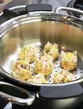 (4)「エクスペリエンス シチューパン&スチーマー」に適量の湯を沸かし、インナースチーマーに(3)を並べて(写真)、中火で10~12分蒸し、器に盛る。