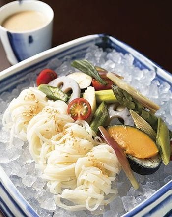 好みの夏野菜(かぼちゃ、オクラ、蓮根、茄子、アスパラガス、スナップえんどう、茗荷、ヤングコーンなど)各適量、ミニトマト、稲庭うどん適量、A[練り胡麻100g、合わせだし(鰹と昆布だし6:醤油1:味醂1)200ml]。