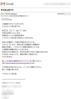 女性は「大学のハラスメント防止委員会のホームページには『被害を受けた学生・生徒および教職員等が、安心してハラスメントの苦情を申し立て、相談を受け付けられる窓口を設置します』と書いてありますが、実際には苦情申立書は被害者本人による手渡ししか受け付けず、電話の際も面談の際も相手方の面談員に名乗ってもらえないなど、とても安心して相談できる窓口ではなかった」と振り返る。