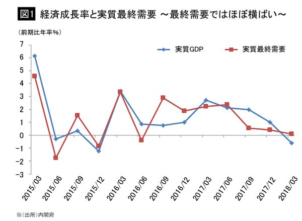 2018年1~3月期の実質GDPは、6月8日公表の2次速報で前期比年率▲0.6%となり、9四半期ぶりのマイナス成長となった。しかし、民間在庫品増加(民間企業の売れ残った在庫の増加分)を除いた最終需要ベースで見ると、前期比年率▲0.0%とマイナス幅は縮小し、少なくとも最終需要面から見た経済規模はそこまで悪化していないとする見方もある。ただ、問題はGDPは必ずしも現在の日本経済の実力を反映しているとは言えないことにある。
