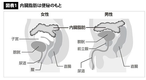 内臓脂肪は意外な病気の原因となっています。よくあるのが便秘や頻尿、逆流性食道炎、腰痛などで、いずれも内臓脂肪が「おなかに付く」ことによるものです。順に見ていきましょう。