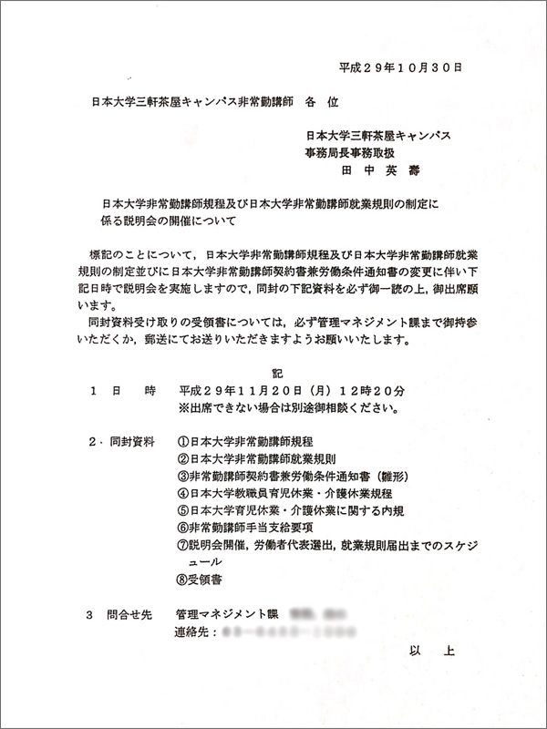この2つの学部は2016年4月に新設された。解雇の方針を打ち出した時、2つの学部を統括する三軒茶屋キャンパスの事務局長兼事務取扱は田中理事長だった。非常勤講師に解雇を言い渡した説明会の通知文書に、田中理事長の名前が載っている。15人の解雇と「丸投げ」や「偽装請負」という違法行為について、田中理事長は認識しているはずだ。