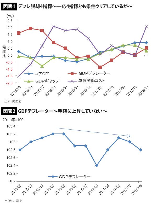 安倍政権は2012年の政権発足以来、デフレ脱却を政権の最優先課題としてきた。そして、安倍政権はデフレ脱却の目安として4指標を重視しているとされており、2018年1~3月期時点では2017年7~9月期以来2四半期ぶりにこの4指標がそろってプラスとなっている(図1)。