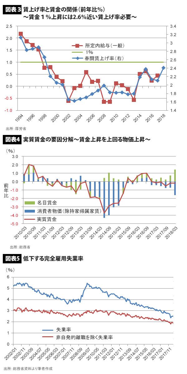 したがって、実質賃金をプラスに持っていくには、まず低下している完全雇用(非自発的離職者がいない)失業率水準にさらに近づけるべく、金融・財政政策の強化が必要となろう。失業率が完全雇用失業率に近づき、さらにそれを下回るにつれ、賃金の上昇率も高まってくるだろう。