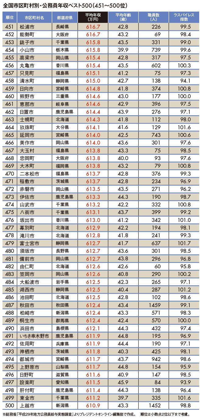 2018公務員給与ランキング #公務員 #年収・給料 2018/06/29 9:00 #1 #2 #3 "地方公務員年収ランキング"トップ500 2018年トップは「厚木市751万円」 PRESIDENT Online プレジデントオンライン編集部 +フォロー 前ページ 1 … 7 8 9 10 11 (図版作成=大橋昭一) 2017"地方公務員年収ランキング"トップ500 【関連記事】 電機業界全417社「平均年収ランキング」 「自動車業界96社」平均年収ランキング 平均年収が高い"トップ500社"ランキング 「金持ち県民、貧乏県民」ランキング 「女性が稼げる」仕事ランキング 1 … 7 8 9 10 11 プレジデントオンライン編集部 関連記事 電機業界全417社「平均年収ランキング」 「自動車業界96社」平均年収ランキング 平均年収が高い"トップ500社"ランキング ランキング 1位 中国は81%で世界一高く、日本は34%で世界一低い…両国の人間性・価値観が180度違う事を決定づけるデータ【2025年12月BEST】 ランキングをもっと見る マネー #公務員 #年収・給料