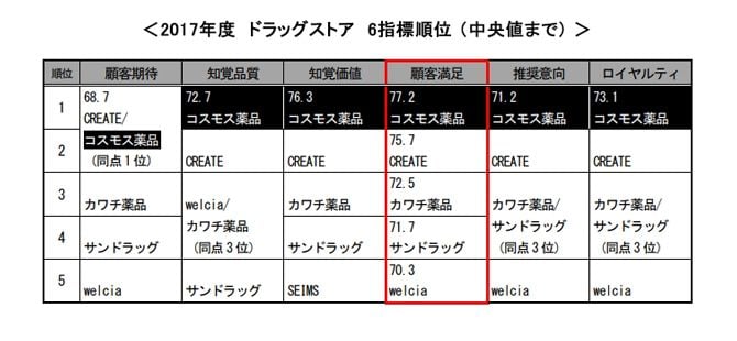 コスモス薬品は、地方拠点のチェーンでありながら、日本生産性本部サービス産業生産性協議会が毎年発表する「日本版顧客満足度指数」調査のドラッグストア部門で、7年連続「顧客満足」1位を獲得している。のみならず、2017年度調査では、「顧客期待」「知覚品質」「知覚価値」「推奨意向」「ロイヤルティ」という、その他すべての指標でもトップに輝いた。