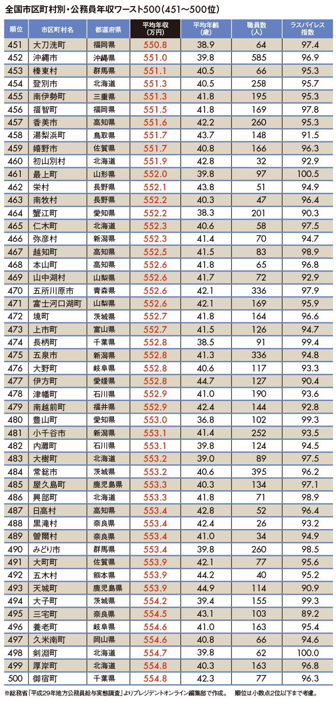 2018公務員給与ランキング #公務員 #年収 2018/07/13 9:00 #1 #2 #3 地方公務員年収ランキングワースト500 41万円上昇でも青ヶ島村が連続1位 PRESIDENT Online プレジデントオンライン編集部 +フォロー 前ページ 1 … 7 8 9 10 11 (図版作成=大橋昭一) 2017"地方公務員年収ランキング"ワースト500 【関連記事】 "地方公務員年収ランキング"トップ500 電機業界全417社「平均年収ランキング」 「自動車業界96社」平均年収ランキング 平均年収が高い"トップ500社"ランキング 2019年卒「就職人気企業」トップ50社 1 … 7 8 9 10 11 プレジデントオンライン編集部 関連記事 "地方公務員年収ランキング"トップ500 電機業界全417社「平均年収ランキング」 「自動車業界96社」平均年収ランキング ランキング 1位 1回10分・室内でもできる…整形外科医が「姿勢も血流もよくなる」と勧める"肋骨ウォーキング"の効果【2026年1月BEST】 ランキングをもっと見る マネー #公務員 #年収 #地方自治体