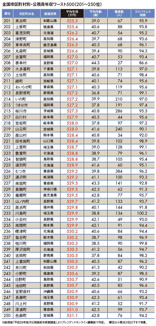 2018公務員給与ランキング #公務員 #年収 2018/07/13 9:00 #1 #2 #3 地方公務員年収ランキングワースト500 41万円上昇でも青ヶ島村が連続1位 PRESIDENT Online プレジデントオンライン編集部 +フォロー 前ページ 1 … 5 6 7 … 11 次ページ 次ページ 1 … 5 6 7 … 11 関連記事 "地方公務員年収ランキング"トップ500 電機業界全417社「平均年収ランキング」 「自動車業界96社」平均年収ランキング ランキング 1位 だからハーンは「熊本は大嫌いだ」と書いた…セツの養父母まで呼び寄せた九州移住がたった3年で破綻したワケ ランキングをもっと見る マネー #公務員 #年収 #地方自治体