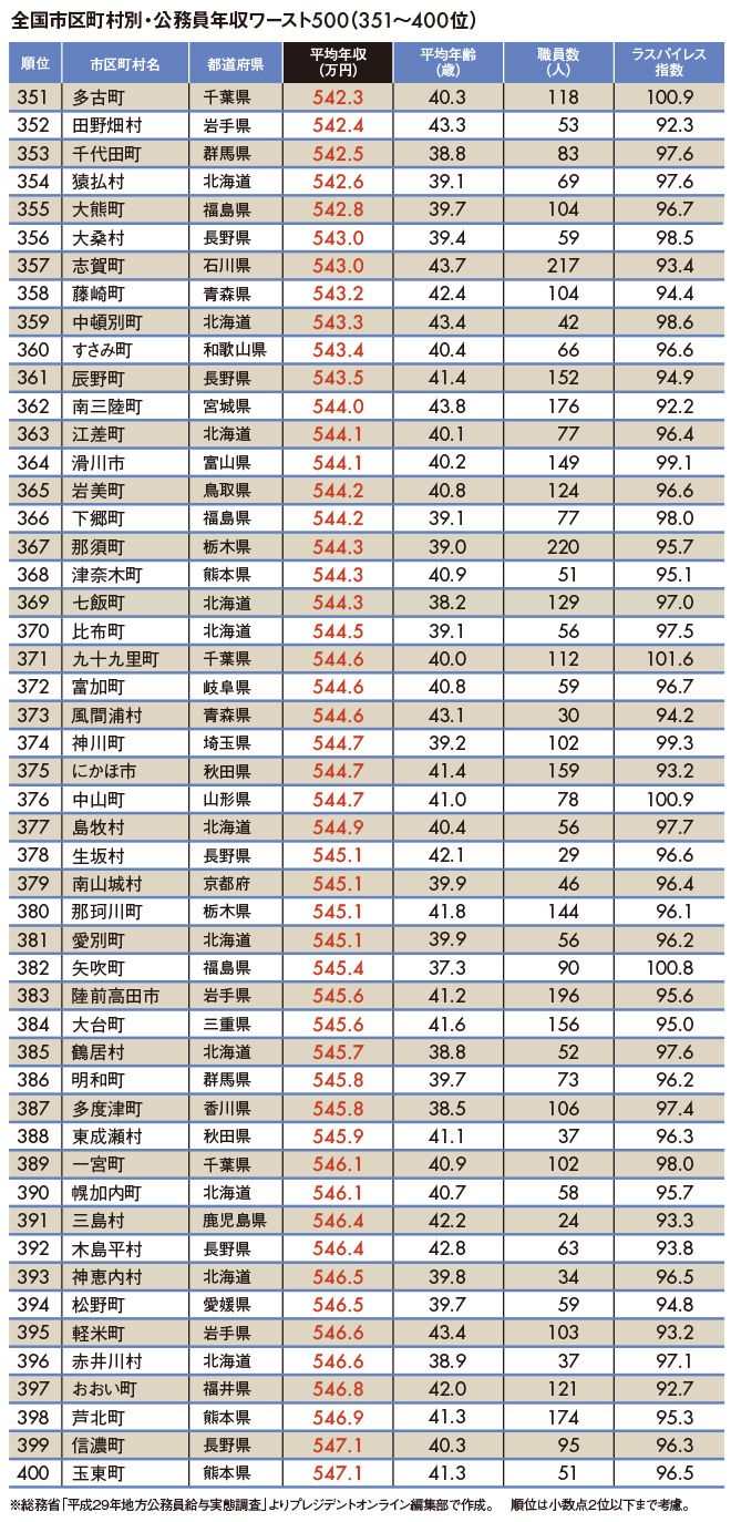 2018公務員給与ランキング #公務員 #年収 2018/07/13 9:00 #1 #2 #3 地方公務員年収ランキングワースト500 41万円上昇でも青ヶ島村が連続1位 PRESIDENT Online プレジデントオンライン編集部 +フォロー 前ページ 1 … 7 8 9 10 11 次ページ 次ページ 1 … 7 8 9 10 11 関連記事 "地方公務員年収ランキング"トップ500 電機業界全417社「平均年収ランキング」 「自動車業界96社」平均年収ランキング ランキング 1位 1回10分・室内でもできる…整形外科医が「姿勢も血流もよくなる」と勧める"肋骨ウォーキング"の効果【2026年1月BEST】 ランキングをもっと見る マネー #公務員 #年収 #地方自治体