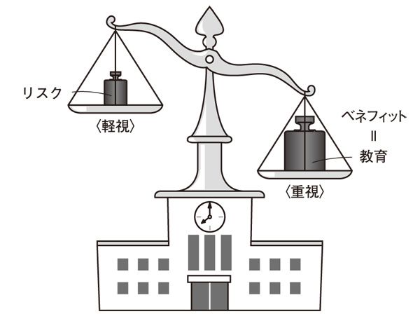 学校では、リスクとベネフィットがそのまま天秤にかけられることはない。先の例で言えば、暴風雨のなかコンビニに行くか、行かないかが素朴に比較検討されることはない。