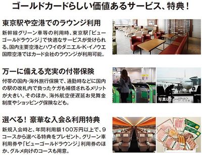 一方、ゴールドカードならではの特典として、入会時と入会翌年以後、年間利用額100万円以上で贈られる豪華プレゼントも魅力的だ。普通列車グリーン車利用券(10枚)、「ビューゴールドラウンジ」利用券(3枚、帯同者も利用可)、紀ノ国屋特選デリカテッセン詰め合わせなど、9コースから選択できる。