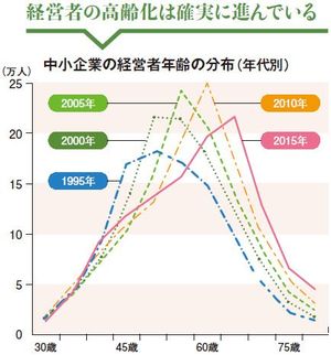 なぜ今、中小企業の事業承継がクローズアップされているのか。背景として大きいのは、やはり経営者の高齢化だ。左の図のとおり、1995年当時47歳だった中小企業の経営者の年齢のピークは、20年後の2015年、66歳に上昇した。つまり、全体で見ればほとんど世代交代が進んでいないのである。