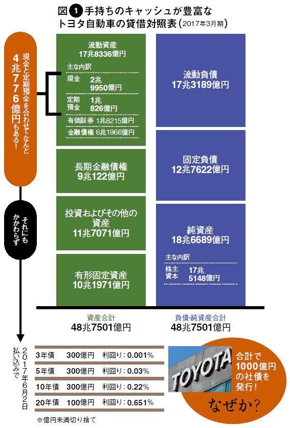 そのトヨタが17年6月2日払い込みで合計1000億円もの社債を発行して注目を集めた。設備投資への充当が目的だが、「4兆円を超える現預金があるのなら、そこから手当てしても十分に残るはず。社債を発行する必要があるのか」と思うのも道理だろう。