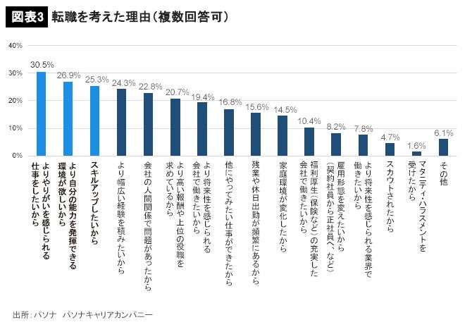 前出のパソナの調査によれば、女性リーダーの4人に3人が「転職を考えたことがある」としています。その理由は、「よりやりがいを感じられる仕事をしたいから」(30.5%)が最も多く、「より自分の能力を発揮できる環境が欲しいから」(25.3%)、「スキルアップしたいから」(23.5%)と続きます。