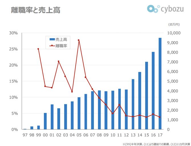 サイボウズの離職率は、2017年の時点で4%。厚生労働省の「平成28年雇用動向調査」によれば、常用労働者の離職率は平均15%だ。しかし、創業時からこのような“ホワイト企業”だったわけではない。青野社長が就任した2005年の離職率は28%超だったという。