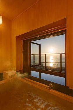 特に熱海らしいのが、総檜造りの温泉が全部屋に配置されているところだ。源泉を注ぐとさわやかな木の香りがいっぱいに広がる。朝日にきらめく海を臨みながらこの温泉を独り占めするもよし、夜の波音を聴きながら静かに思索に耽るもよし。大人にだけ許された贅沢な時間の過ごし方だ。