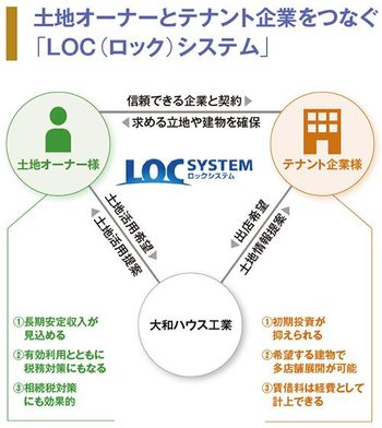 土地オーナーをサポートし、最適なテナント選びを実現するのが、大和ハウス工業の「LOC(ロック)システム」である。同社が築いてきた膨大な数の土地オーナーおよび約4000社に上るテナント企業とのネットワークを基盤に、土地オーナーと出店(立地)を考える企業のマッチングを推し進める。