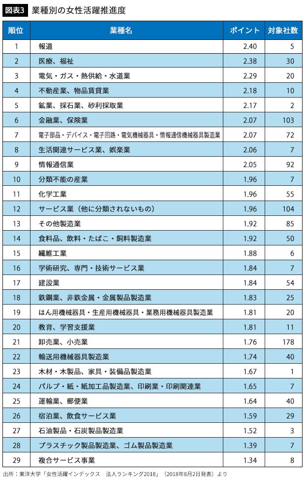 今回の東洋大学の調査で興味深いのは、業種別の女性活躍推進度も分析している点です。