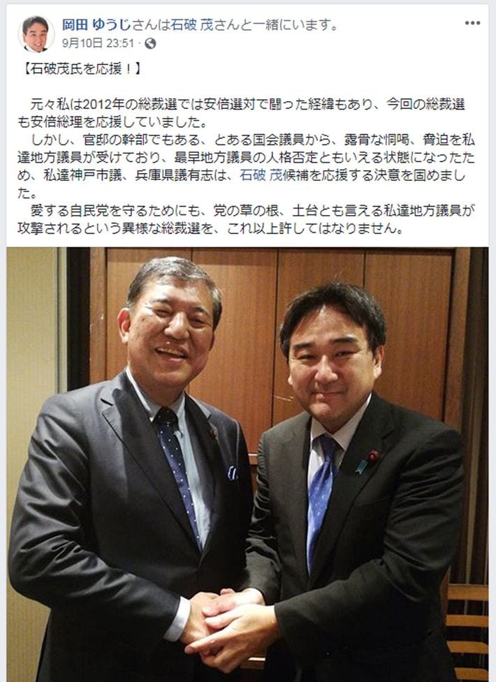 しかし、官邸の幹部でもある、とある国会議員から、露骨な恫喝、脅迫を私達地方議員が受けており、最早地方議員の人格否定ともいえる状態になったため、私達神戸市議、兵庫県議有志は、石破茂候補を応援する決意を固めました。