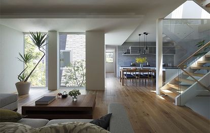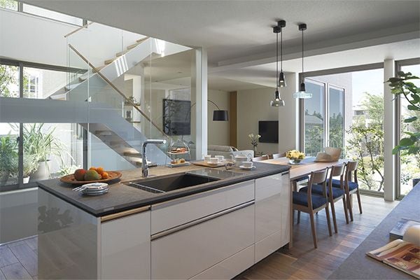 下の写真でご紹介しているビエナは、3階建ての中間層にあたる2階にリビングダイニングを配置。吹き抜けの階段部分には上階から下まで光が届き、バルコニーと中庭にある大きな開口部からも日差しが降り注ぐ、じつに開放的なつくりになっている。