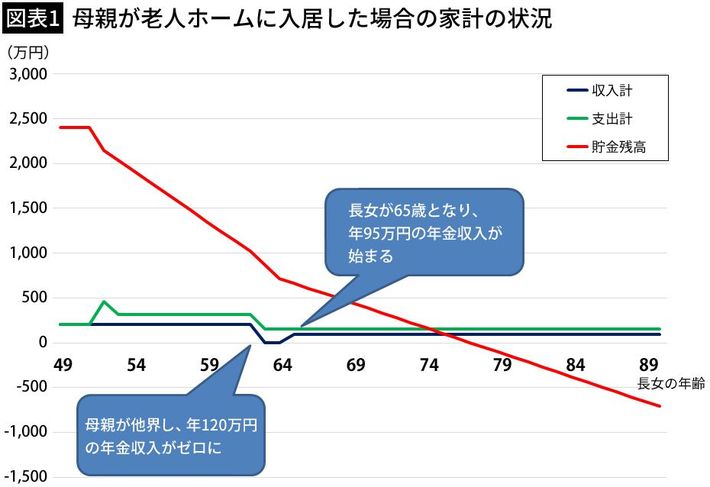 この場合、老人ホームと自宅で2人が別れて暮らすより安上がりです。シミュレーションでは、長女が90歳になるまで貯蓄がもつことがわかりました。母親が老人ホームに入居するケースと比べ、16年も貯蓄が長持ちする計算です。