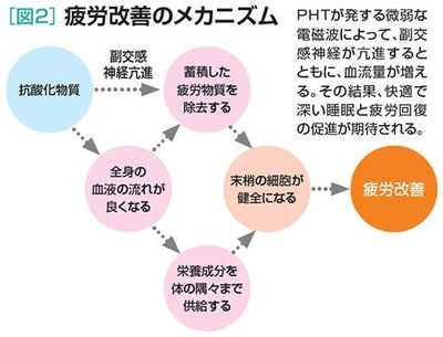 PHTは微弱な電磁波を発する。携帯電話や電子レンジなどの電気的な電磁波とは異なり、遠赤外線の一種だ。これが、自律神経の中でもリラックス状態に働く副交感神経に作用し、筋肉の緊張をほぐし、血流を促し、疲労回復をサポートする。つまり、軽い運動によって老廃物を排出させ疲労回復を促すアクティブレストの状態を、睡眠時というパッシブレスト時に実現できる。「ベネクス リカバリーウェア」は、そうした画期的な商品なのである(図2参照)。