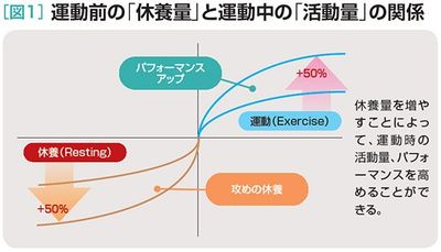 そして行動改革では意識的に質の高い休養を取る“攻めの休養”を提案する。オーストラリア国立スポーツ研究所の研究によれば、アスリートたちが漫然と休養を取るのでなく、運動前に質の高い能動的な休養を取り、休養量を増やすことで、その後のパフォーマンスがよりアップすることがわかっている(図1参照)。