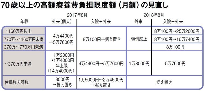 まず負担増の第1は、高額医療費で70歳以上の高齢者の自己負担です。例えば、年収370万円未満で住民税を支払う中所得者は17年8月以降、外来受診時の上限が月額1万2000円から1万4000円。さらに、18年8月には1万8000円に上がります。