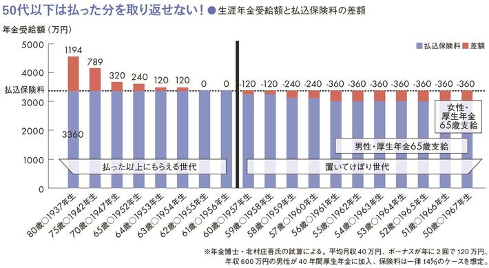 年金保険料を「払った以上にもらえる世代」は60代以上。それ以下は「置いてけぼり世代」になる。