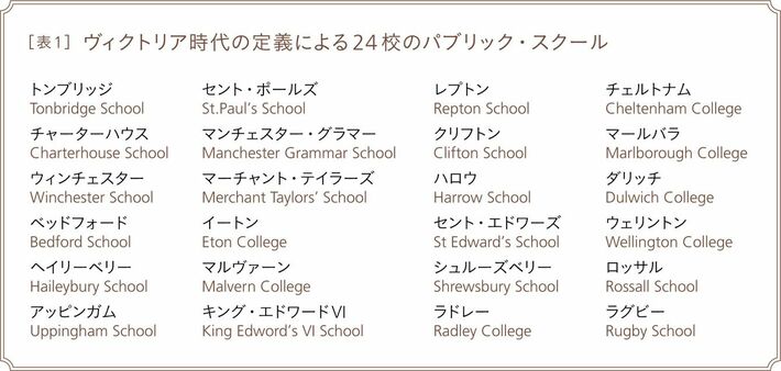 パブリック・スクールの定義は、厳密にいうとヴィクトリア時代にまとめられました。はじめは「ザ・ナイン」(イートン・カレッジ、マーチャント・テイラーズ・スクール、ラグビー・スクール、ウェストミンスター・スクール、シュルーズベリー・スクール、セント・ポールズ・スクール、ウィンチェスター・カレッジ、チャーターハウス・スクール、ハロウ・スクール)と、さらにそれらを含む24校(表1参照)が値するとされてきました。