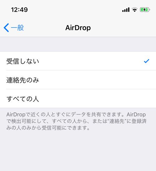 設定方法は以下の通りだ。iPhoneの設定から「一般」→「エアドロップ」と選択し、「受信しない」あるいは「連絡先のみ」を選んでおこう。「連絡先のみ」にした場合は、端末に連絡先が登録されている知人や友人とだけファイルのやり取りが可能となる。写真や動画の送受信時など、エアドロップ機能を使いたいときだけ受信する設定に変更してもいいだろう。