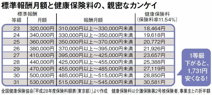 図表にあるとおり、たとえば報酬月額が48万5000円以上51万5000円未満の人は30等級で、標準報酬月額(仮の報酬)は50万円に当たる。健康保険では、5万8000円から139万円まで50等級に分類。標準報酬月額が多いほど等級が上がり、保険料も高くなっていく。