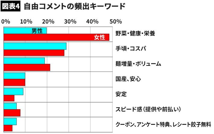 この「麺増量」に関するコメント記入割合は、男性より女性のほうが多いのである。ちなみに約300人の回答者のうち「小盛のメニューがある」というコメントは男性2人のみで、女性のコメントは皆無だった。