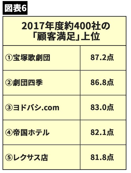 「ガッツリ派」の満足度(85.2点)がどのくらい高いか、2017年度に調査した約400企業・ブランドの「顧客満足」調査結果と比べてみよう(図表6)。リンガーハットの85.2点を上回るのは、1位の宝塚歌劇団(87.2点)、2位の劇団四季(86.8点)というエンターテインメントの最高峰だ。一方のリンガーハットは日常的な飲食業。「ガッツリ派」による評価の高さはホンモノである。