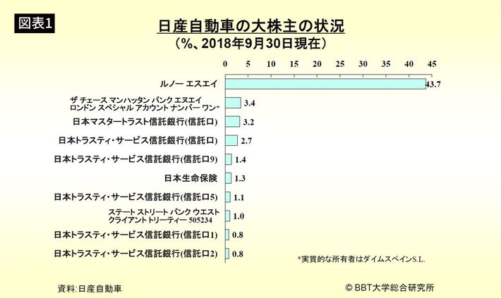 日産の株主構成を見ると、ルノーは発行済株式の43.7%を保有している。大株主として、株主総会のときには強い影響力を行使できる状態だ(集計時点によっては43.4%となるが本稿では43.7%として話を進める)。