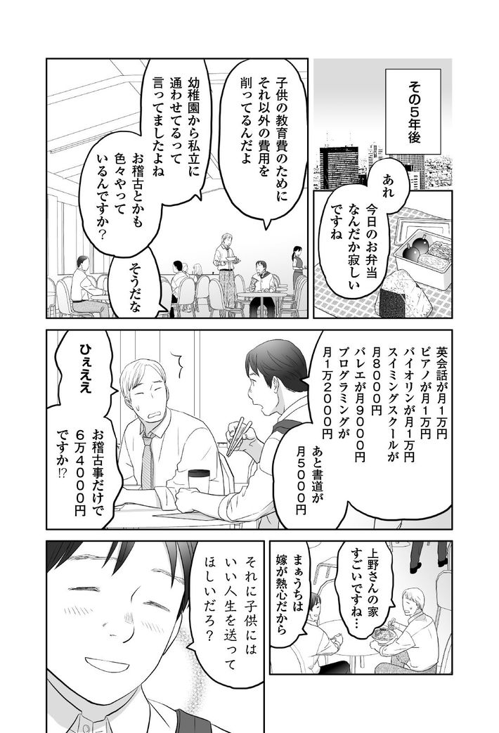 #教育費 #幸福度 2018/12/13 9:00 年収1000万でも"教育費貧乏な家"の末路 夫婦関係の満足度は"子なし"が有利 PRESIDENT Online 鈴木 信行 +フォロー 日経ビジネス副編集長 1 2 3 4 5 次ページ 子供がいる人は絶対に幸せで、そうでない人は絶対に不幸なのか。「教育費」の重さを考えると、そうは言い切れない。年収1000万円程度の家庭が、子供の教育にお金を注ぎ込みすぎると、どうなるのか。『マンガ 宝くじで1億円当たった人の末路』(日経BP社)より、一部をご紹介します――。 全ての画像を見る(16枚) 次ページ 1 2 3 4 5 『宝くじで1億円当たった人の末路』(日経BP社) 著者 鈴木 信行 AMAZONで購入する 『マンガ 宝くじで1億円当たった人の末路』(日経BP社) 著者 鈴木 信行 (その他)星井 博文、松枝 尚嗣ほか AMAZONで購入する 関連記事 「習い事三昧・塾通い・私立受験」の末路 7500万円タワマン買う共働き夫婦の末路 看護師の妻と暮らす夫は最強の「勝ち組」 ランキング 1位 中国は81%で世界一高く、日本は34%で世界一低い…両国の人間性・価値観が180度違う事を決定づけるデータ ランキングをもっと見る マネー #教育費 #幸福度 #少子高齢化 #子育て #貧困 #家計
