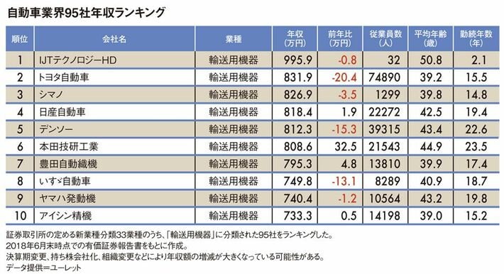 プレジデントオンラインは全上場企業の「平均年収ランキング(2018年版)」を作成した。このうち「輸送用機器」に分類される95社のデータを集計したところ、いすゞ自動車系の自動車部品メーカーであるIJTテクノロジーホールディングスが平均年収996万円で1位となった。2位はトヨタ自動車、3位はシマノだった。ランキングの詳細をお伝えする――。