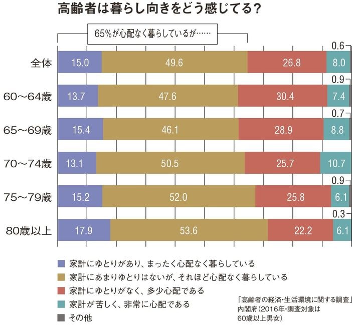 定年までの貯蓄と2000万円前後の退職金、それに妻と合わせた年金が月二十数万円──。「老後はほぼ心配ない」というのが、大手・中堅企業を定年退職した人たちの感慨ではないだろうか。60歳以上の高齢者対象の内閣府の調査(2016年)でも65%の人が心配なく暮らしている(図参照)。