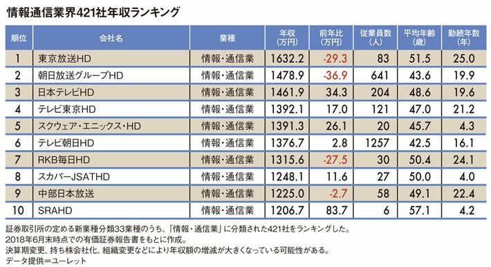 プレジデントオンラインは全上場企業の「平均年収ランキング(2018年版)」を作成した。このうち「情報・通信業」に分類される421社のデータを集計したところ、東京放送ホールディングス(TBSHD)が平均年収1632万円で1位となった。2位は朝日放送グループHD、3位は日本テレビHD、4位はテレビ東京HDで、テレビ局が上位を占めた。ランキングの詳細をお伝えする――。