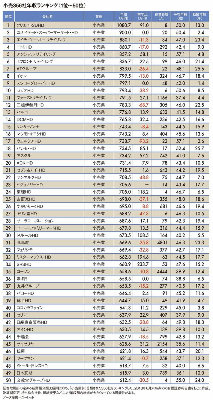 「平均年収ランキング」2018 #ランキング #ドラッグストア 2018/12/25 9:00 #3 #4 #5 #6 #7 #8 小売業界356社「平均年収ランキング」 1位はドラッグの「クリエイト」 PRESIDENT Online 鎌田 正文 +フォロー ビジネスリサーチ・ジャパン代表 前ページ 1 2 3 4 5 … 9 次ページ 次ページ 1 2 3 4 5 … 9 関連記事 平均年収が高い"トップ500社"ランキング 電機業界全304社「平均年収ランキング」 平均年収が低いワースト500社ランキング ランキング 1位 中国は81%で世界一高く、日本は34%で世界一低い…両国の人間性・価値観が180度違う事を決定づけるデータ ランキングをもっと見る マネー #ランキング #ドラッグストア #上場企業 #小売・コンビニ #年収