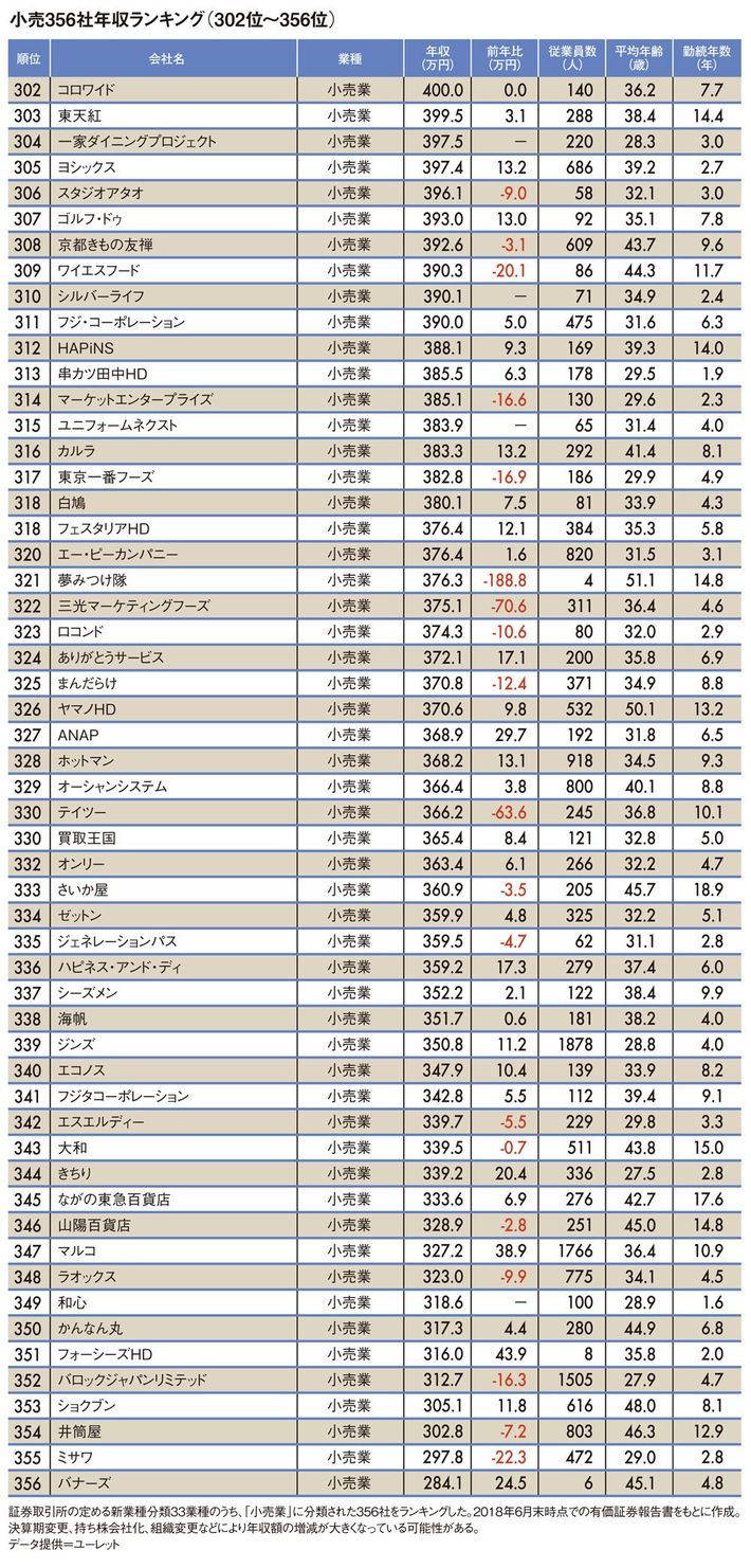 「平均年収ランキング」2018 #ランキング #ドラッグストア 2018/12/25 9:00 #3 #4 #5 #6 #7 #8 小売業界356社「平均年収ランキング」 1位はドラッグの「クリエイト」 PRESIDENT Online 鎌田 正文 +フォロー ビジネスリサーチ・ジャパン代表 前ページ 1 … 5 6 7 8 9 (図版作成=大橋昭一) 【関連記事】 平均年収が高い"トップ500社"ランキング 電機業界全304社「平均年収ランキング」 平均年収が低いワースト500社ランキング "地方公務員年収推計"都道府県ランキング 自動車業界95社「平均年収ランキング」 1 … 5 6 7 8 9 鎌田 正文(かまた・まさふみ) ビジネスリサーチ・ジャパン代表 1995年、ビジネスリサーチ・ジャパン設立。金融・流通・メーカーなどの各分野から経済全般まで、幅広く取材、執筆。『2012年版 図解 これから伸びる企業が面白いほどわかる本』など、業界研究の著作多数。 <この著者の他の記事> なぜ三菱商事の平均年収は380万円も上がったのか…平均年収が高い「全国トップ500社」ランキング2023【2024上半期BEST5】 X 関連記事 平均年収が高い"トップ500社"ランキング 電機業界全304社「平均年収ランキング」 平均年収が低いワースト500社ランキング ランキング 1位 2026年1月に「日本人の国」の終わりが始まる…高市早苗が保守を裏切って進める「民族置換」の衝撃シナリオ ランキングをもっと見る マネー #ランキング #ドラッグストア #上場企業 #小売・コンビニ #年収