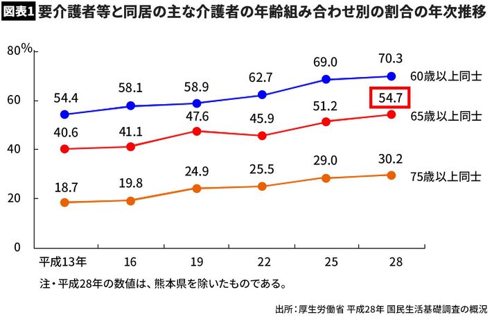 80、90代の親を介護する場合、介護する子供の推定年齢は60、70代です。いわゆる“老老介護”の状況です。厚生労働省の「国民生活基礎調査」(2016年)では、在宅介護している世帯の54.7%が、65歳以上の高齢者を同じ65歳以上の高齢者が介護している「老老介護」状態にある、という結果が出ています(図1)。