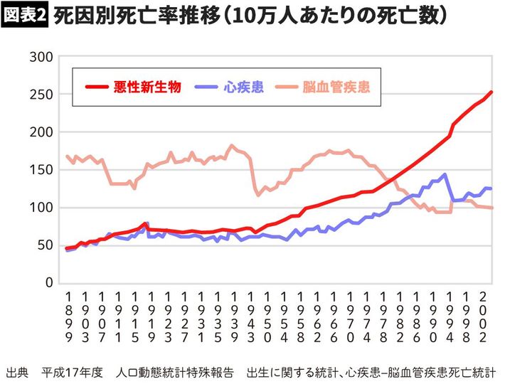 図表2は死因別死亡率推移を示したものです。長い間、死因死亡率の第1位は脳血管疾患(脳卒中)でしたが、現在は減少しています。
