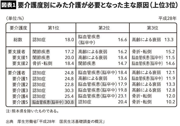 要介護4では、第1位の認知症と第2位の脳卒中は僅差ですから、脳卒中は寝たきり(に近い)状態の最大原因と言うことができるでしょう。