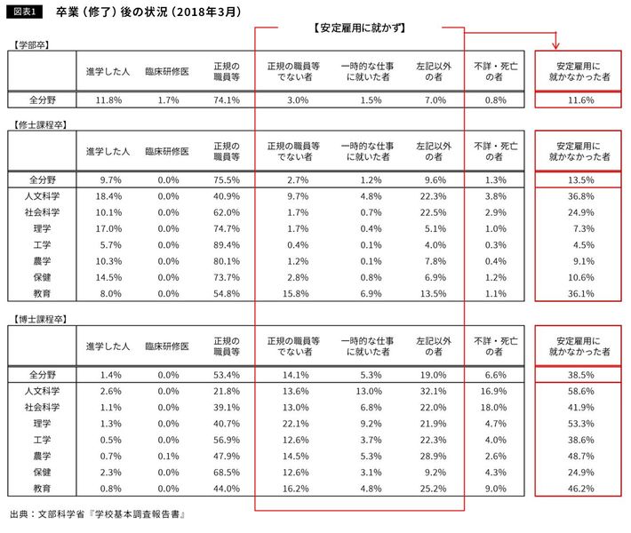 図表1は、文部科学省『学校基本調査』を資料に、卒業(修了)後の状況をまとめたものである。安定雇用に就かなかった者の比率に注目すれば、学部卒は11.6%であるのに対し、人文科学や教育の修士卒のその比率は3割以上。博士課程にいたっては、領域を問わず、きわめて不安定な状況が見出される。人文科学系では58.6%という値を示し、修士卒では好調な理系も、博士卒の場合、理学53.3%、工学38.6%、農学48.7%が安定雇用に就けずにいる。