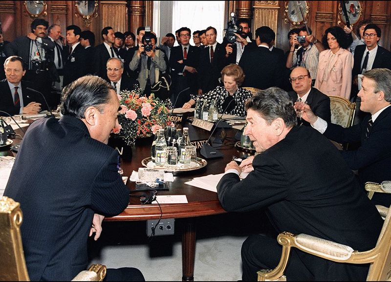 洋の東西を問わず、役人は文章の表現にきわめて厳格で、文章が大切だというコンセンサスがある――久保田氏が各国の高級官僚と共にサミット宣言の原案作成に参加した、1986年の東京サミットの一場面(写真=AFP/時事通信フォト)