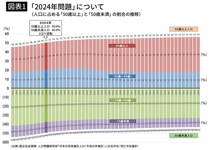 2018年5月、自由民主党政務調査会は「『2024年問題』:人生100年時代を生きる将来世代の未来を見据えて──『選択する社会保障』」と題する政策提言を発表した。その冒頭には次のように書かれている。「わが国は、人生100年時代が到来し、6年後の2024年には歴史上初めて50歳以上の人口が5割を超える国となる。まさに、どの国も経験したことのない事態であり、『2024年問題』とも言える」。(図表1)
