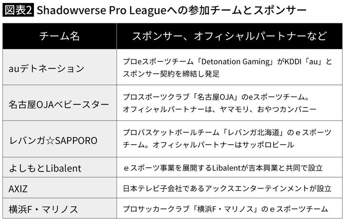 ゲーム会社以外の異業種からの参入が相次いだことで、プロリーグ環境の整備も進んできた。2018年3月には、エイベックス・エンタテインメント、Cygames、AbemaTV、CyberZの4社の合同により、プロリーグ「RAGE Shadowverse Pro League」が開催されることが発表された(図表2)。また同タイトルでは、年に数回の大規模賞金制大会も開催されており、2018年12月15日~16日にかけて実施された大会では、優勝賞金が100万ドルと日本国内で初めて賞金が1億円を超えた大会としても大きな注目を集めた。これまでの国内開催のeスポーツ大会の賞金は、一般的には多くても数百万円であり、最高でも3000万円であった。
