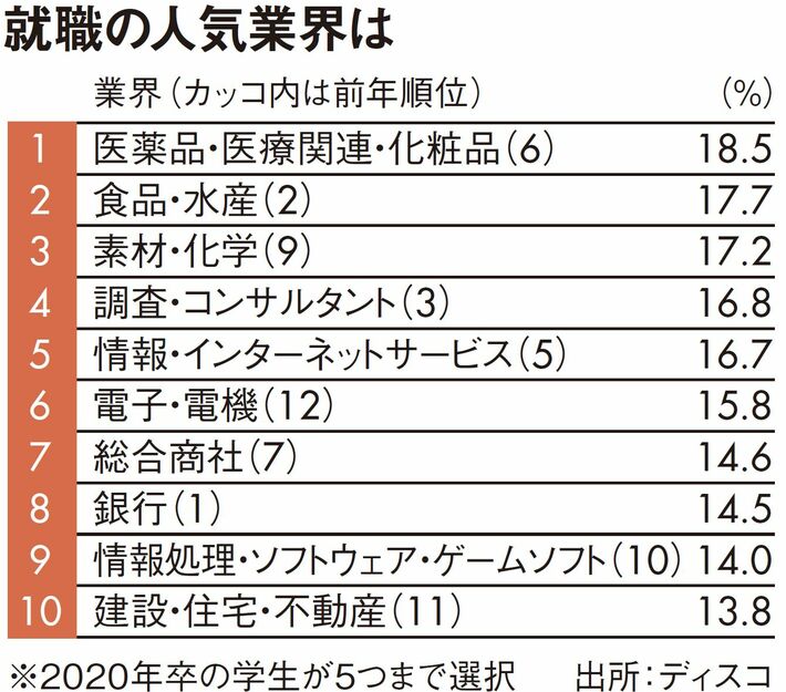 逆に順位を大きく伸ばしたのが18年6位から首位に立った「医薬品・医療関連・化粧品」だ。武井氏は「大学院に行かない学部卒の理系女子が、化粧品会社などの商品企画・マーケティングを志望する傾向にあります。医薬品や化粧品のメーカーはホワイト企業のイメージが強く、職場環境を重視する最近の学生から人気が高まっています」と説明する。